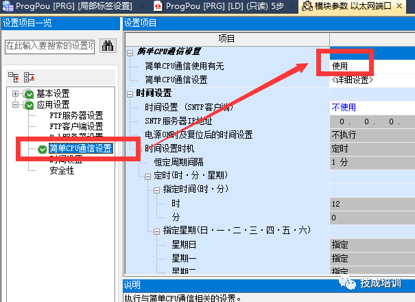 第2步:打开GXWorks3,在工程-参数-FX5UCPU-模块参数-以太网端口-应用设置-简单CPU通信设置中把简单通信使用有无选择“使用”。