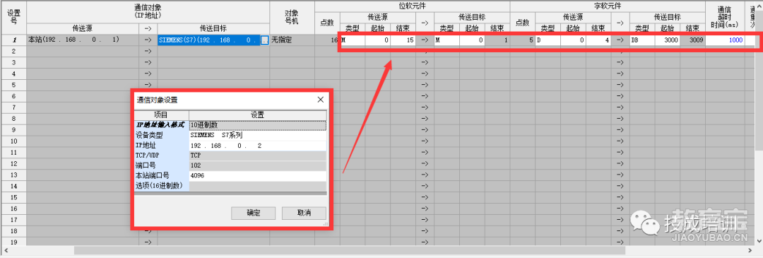 第3步:在第2步的基础上,双击简单CPU通信设置中的<详细设置>,设置一下通信的数据。例:本站地址192.168.0.1,从站地址192.168.0.2,执行写入,由本站的M0~M15传送给从站的M0~M1。由本站的D0~D4传送给从站的DB1中。从站IP地址要跟主站的IP地址保持在同一网段,即最后一位不一样,其他一致。
