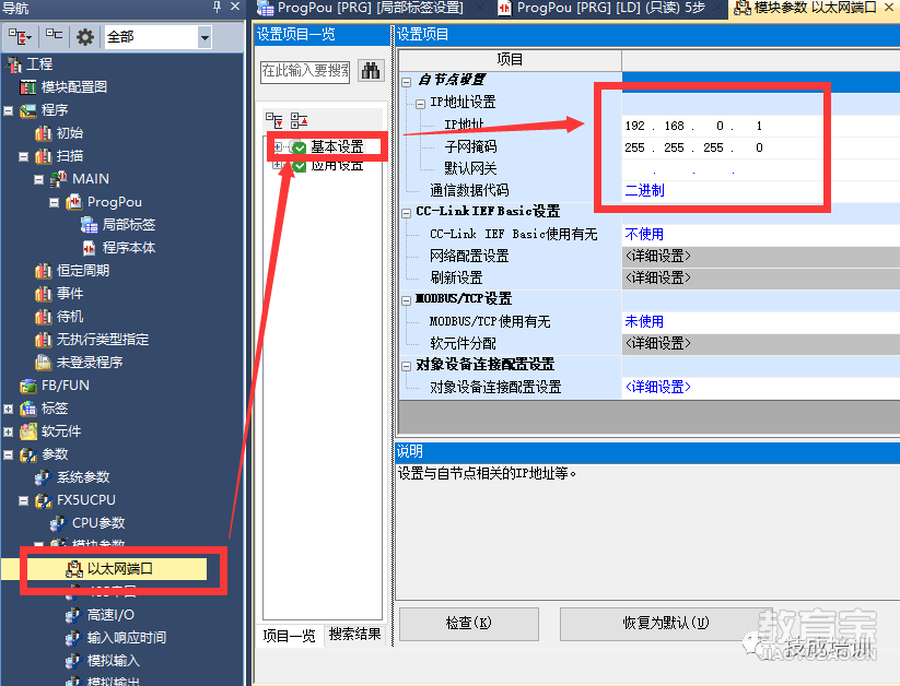 1:一台三菱FX5UPLC(型号:FX5U-32MT/ES)2:一台西门子S7-1200PLC(型号:s7-1200DCDCDC)3:软件——GXWorks3、TIA Protal v16实验内容:FX5U做主站、S7-1200系列PLC为从站,简单的数据传送。二、PLC通讯设置第1步:打开GXWorks3,在工程-参数-FX5UCPU-模块参数-以太网端口-基本设置中设置IP地址以及子网掩码。IP地址的作用是为了跟S7-1200PLC建立通讯,子网掩码的作用是确认两个PLC的IP地址在同一网段上。