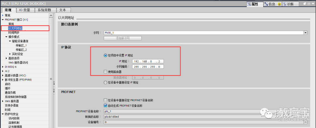 注意:三菱和西门子通过简单CPU通信时走的是S7协议,三菱中设置读取DB块时,数字编号是6位数字,前三位表示DB块号,后三位表示DB中的偏移地址,所以DB块编号不能超过1000,偏移地址也不能超过1000。位软元件(字单位,1点相当于8点的量。)I0~255起始: 仅指定偶数地址。 最后: 仅指定奇数地址。Q0~255起始: 仅指定偶数地址。 最后: 仅指定奇数地址。M0~255起始: 仅指定偶数地址。 最后: 仅指定奇数地址。字软元件DB001000~255511,高3位: 块号,低3位: 地址范围。 在最后三位数字的开头只能指定偶数地址,在最后三位数字的结尾只能指定奇数地址。 (由于1点的大小为1个字节,因此在指定字时必须指定2点。)第4步:打开TIA Protal v16,在常规-以太网地址中填写好IP地址以及子网掩码。