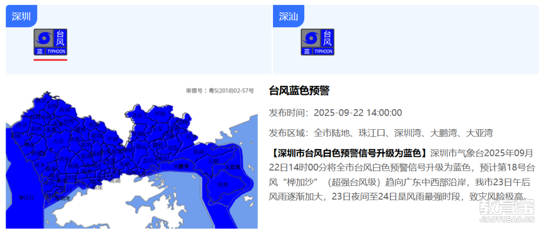 【深圳市台风白色预警信号升级为蓝色】深圳市气象台2025年09月22日14时00分将全市台风白色预警信号升级为蓝色,预计第18号台风“桦加沙”(超强台风级)趋向广东中西部沿岸,我市23日午后风雨逐渐加大,23日夜间至24日是风雨*强时段,致灾风险极高。