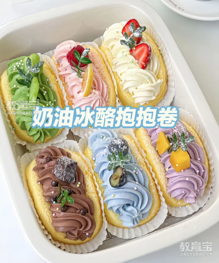 嗨…·夏日限定甜品,高颜值的冰乳酪抱抱卷!!香醇浓郁的冰凉乳酪搭配绵密松软的蛋糕,一口下去,双重美味!做法简单,绵软香甜,一口一个,小白也可以成功get!真的每个口味都好吃!喜欢的小伙伴快试试!准备食材:蛋糕卷: 鸡蛋5个、低筋面粉50g、细砂糖50g、牛奶50g、玉米油50g 乳酪夹馅: 淡奶油60g、奶油奶酪10g、白砂糖6g 【其他口味草莓粉5gl抹茶粉5g|可可粉5g|紫薯粉5g|蝶豆花粉2g】