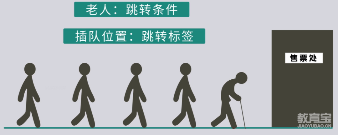 以车站买票为例,解释跳转条件、跳转位置和结束指令的概念。跳转条件就像孕妇或老人插队的情况,当满足特定条件时,程序执行会发生跳转。跳转位置则是插队的位置,用标签来表示。结束指令就如同临时不想买票而结束买票的情况。