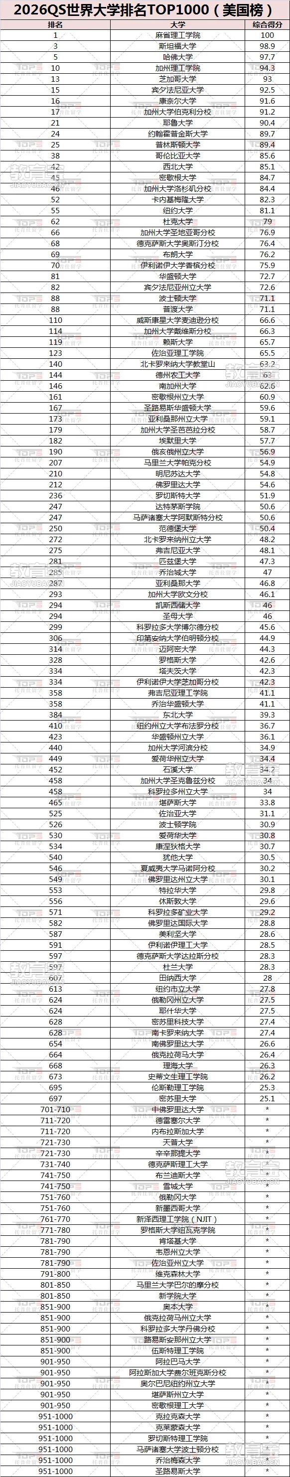 接下来看看2026QS世界大学排名0中美国高校的具体变现吧。