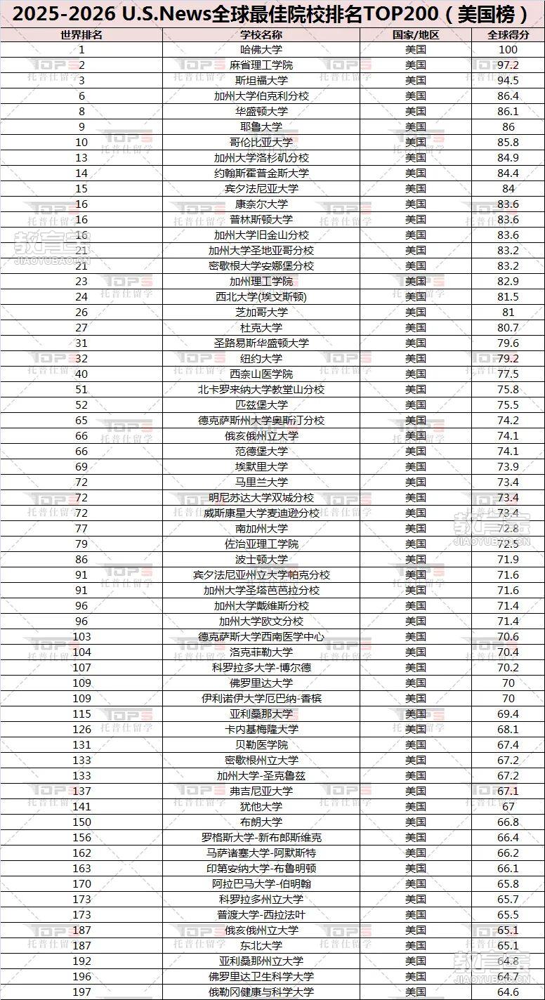 看排名、看位置、看专业、看国家、看费用、看实力......这些是留学生家庭在筛选院校时非常关注的维度,而业界公认的四大权威世界大学排名提供了重要参考。截至目前,U.S.News、QS、软科纷纷官宣了2025-2026版世界大学排名榜单,对于规划申请及正在美国大学就读的同学们来说,一定想了解自己关注/就读的大学处于世界排名哪个段位吧。本文托普仕留学小助手(微信ID:topsedu2019)针对美国高校在世界大学排名中的表现情况进行了汇总,一起来看看吧~2026QS世界大学排名美国大学表现