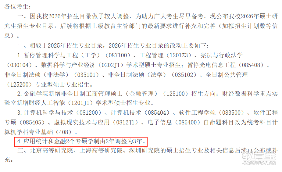 来源:https://shxy.ccnu.edu.cn/info/1207/19575.htm江西财经大学2026年招生目录做了较大调整,应用统计和金融2个专硕学制由2年调整为3年。