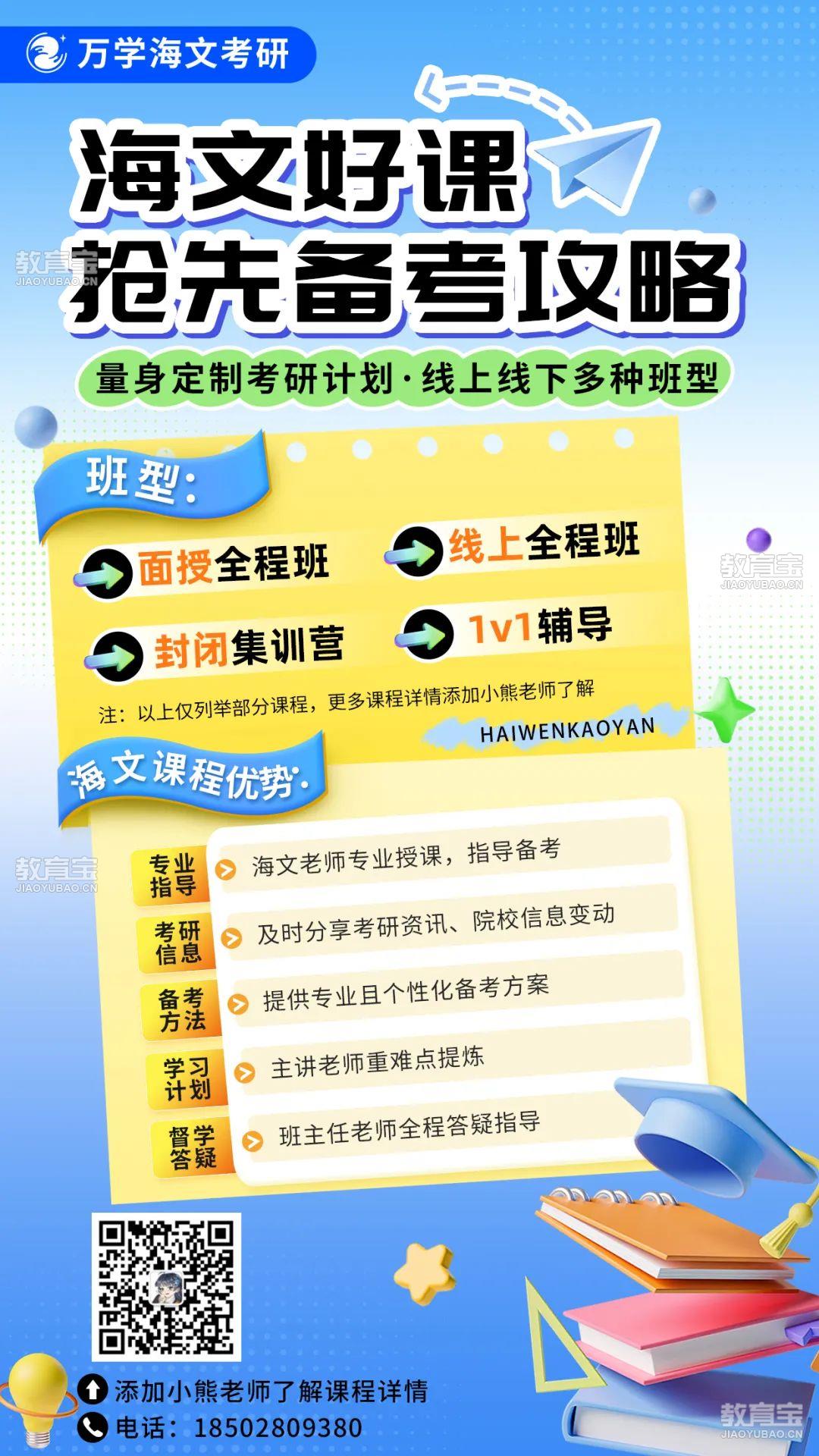 针对明年考研的小伙伴:海文考研全科课程火热招生中!不仅可以帮你留意最新招考资讯,还包含1对1专属择校择专服务、考点基础学习、精细学习方案制定、学习资源优化配置、考点拉网测评及薄弱点锁定、深度答疑指导等在内的多个辅导项目和学习氛围浓厚、舒适安全的学习生活环境。扫描下方二维码了解课程详情。