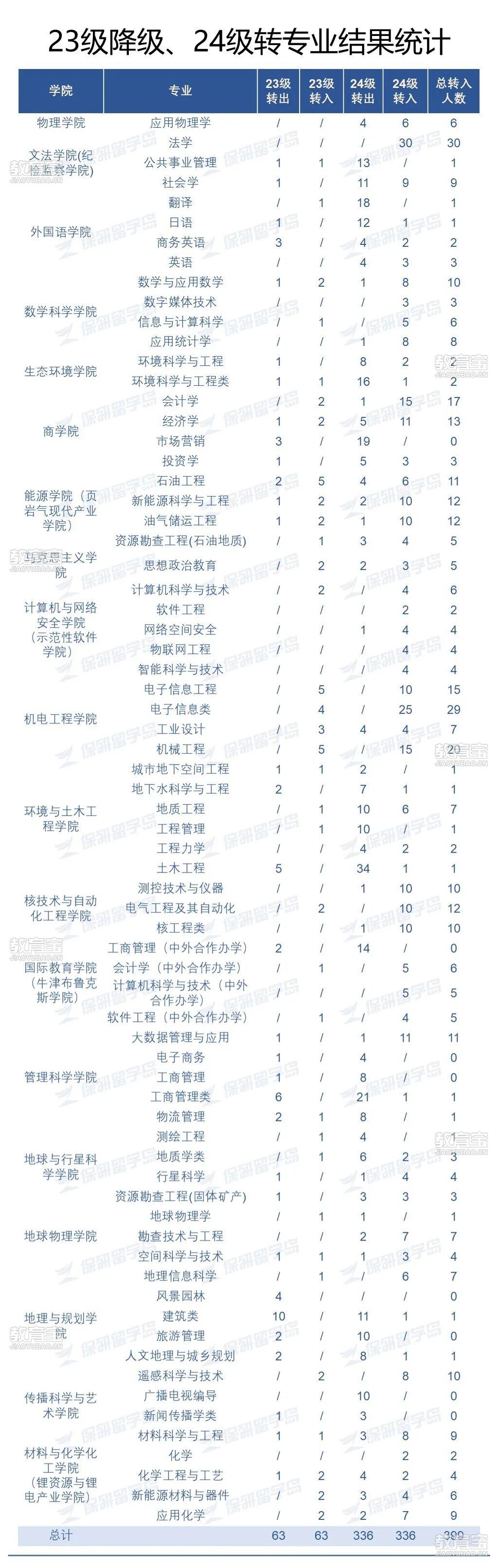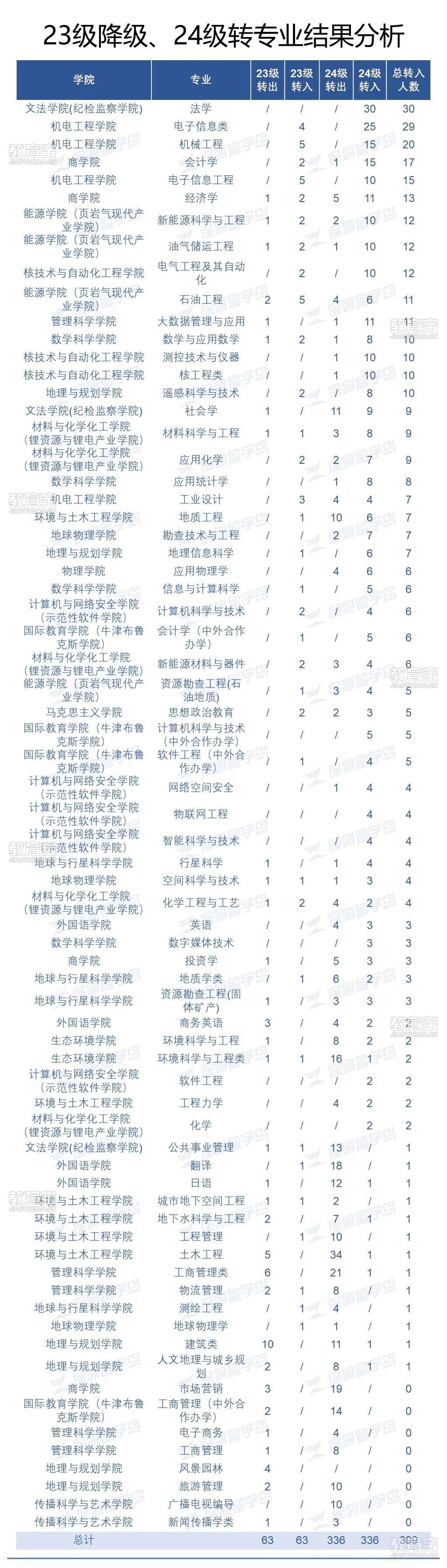 成都理工大学规定,本科生在大一下期末,大二下期末和大三下期末各有1次转专业的机会。需要特别注意的是,成都校区和宜宾校区不能跨校区互转。以下分析成都理工大学2025年本科生的转专业结果。02转专业结果统计2025年共有401名同学成功转专业,24级转专业336人;23级转专业64人,其中63人为降级转专业,仅1人从地球物理学院空间科学与技术专业平级转入地理与规划学院建筑类。另有22级1人从机电工程学院电子信息工程专业降级转入23级管理科学学院物流管理专业。由于其他转专业情况人数较少,在此单独说明,下表仅统计24级平级转专业336人和23级降级转专业63人的情况。具体如下: