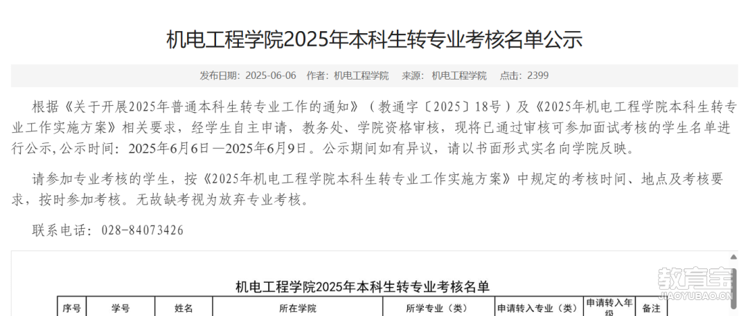 01转专业数据分析2025年6月,成都理工大学各学院发布了2025年本科生转专业拟录取名单,共有401名学生成功转专业。成都理工大学机电工程学院2025年本科生转专业考核名单公示通知