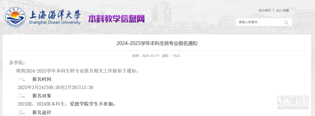 03转专业分析上海海洋大学2024-2025学年共有188人转专业,其中24级共161人,一志愿录取145人;23级共27人,一志愿录取21人。根据上海海洋大学2024年招生人数3205人,2023年招生人数3177人,依次可得转专业率为5.02%、0.85%。下面对23级和24级的一志愿转专业结果分别进行分析。从23级转专业整体情况来看,33人申请转专业,最终一志愿转专业21人,二志愿转专业6人,即共27人成功转专业,转专业报录比为81.82%。就一志愿录取情况来看,经济管理学院是录取人数(6人)*多的学院,除无人转入的专业外,各专业录取人数均在1~3人。外国语学院的日语专业(剩余7人)是剩余名额较多的专业。其次是海洋科学与生态环境学院的海洋资源与环境专业和海洋技术专业,剩余名额均为4人。从24级转专业整体情况来看,253人申请转专业,最终一志愿转专业145人,二志愿转专业16人,即共161人成功转专业,转专业报录比为63.64%。就一志愿录取情况来看,食品学院是录取人数(28人)*多的学院,其次是信息学院(27人)。而爱恩学院仅有3人转入。从专业来看,信息学院的计算机类专业是转入人数(23人)*多的专业,其次是食品学院的食品科学与工程专业和水产与生命学院的水产养殖学专业(10人)。海洋科学与生态环境学院的海洋资源与环境专业、海洋科学专业和信息学院的计算机类(均剩余8人)是剩余名额*多的三个专业。可以看出,上海海洋大学转专业名额较多,且大部分专业都有剩余名额。在考核方面,各学院重视学业*,并安排面试/笔试,对一志愿专业和二志愿专业分别进行评分,若面试*不合格,可以被降级录取,除部分热门专业如电气工程及其自动化、金融学、能源动力工程等竞争相对激烈外,转专业难度整体不高。04转专业政策梳理上海海洋大学及其各个学院在学校和学院官网公布了转专业实施细则,包括申请条件、工作流程以及各学院的2024-2025学年各年级专业转专业接收计划、报名条件、基本考核方案等,可以前往官网查看具体内容。上海海洋大学2024-2025学年转专业通知