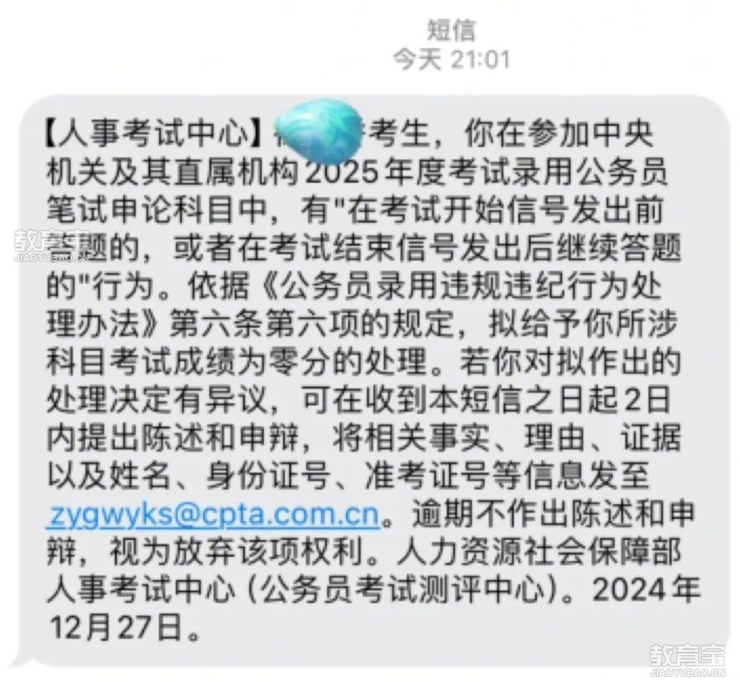 (图源自网络)之前有网友晒出自己收到了2025年国考的笔试违纪通知及告知书,因其有在考试开始信号发出前答题的或者在考试结束信号发出后继续答题的行为,拟给予该科0分处理。