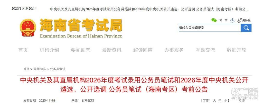 速览!官方发布2026公务员考前公告2026年国考、中央遴选&选调笔试将于11月29日至11月30日举行,海南考区率先发布了考前公告!山西的小伙伴们可以提前参考看一下,事关笔试时间、考试科目及笔试注意事项。中央机关及其直属机构2026年度考试录用公务员笔试和2026年度中央机关公开遴选、公开选调 公务员笔试(海南考区)考前公告