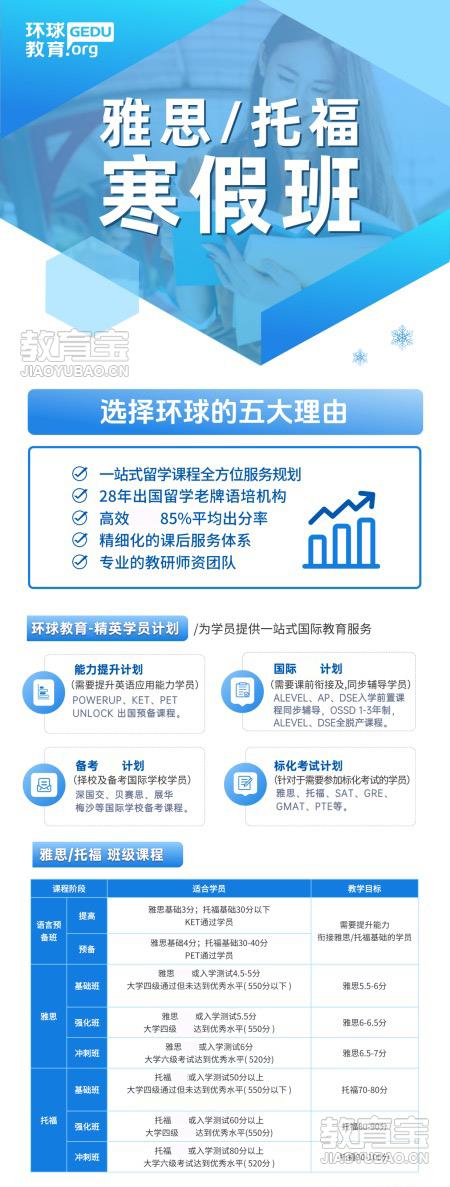 我们以国际化教育集团的标准,促进产业创新,引领行业发展,大力推动中国教育事业的进步与发展。20多年来,环球教育不断壮大,旗下拥有300余家教学中心,遍布中国200多个城市,累计为六十余万名学员提供专业、多元的教育服务,为中国培养具有全球视野的国际化人才做出应有的贡献。