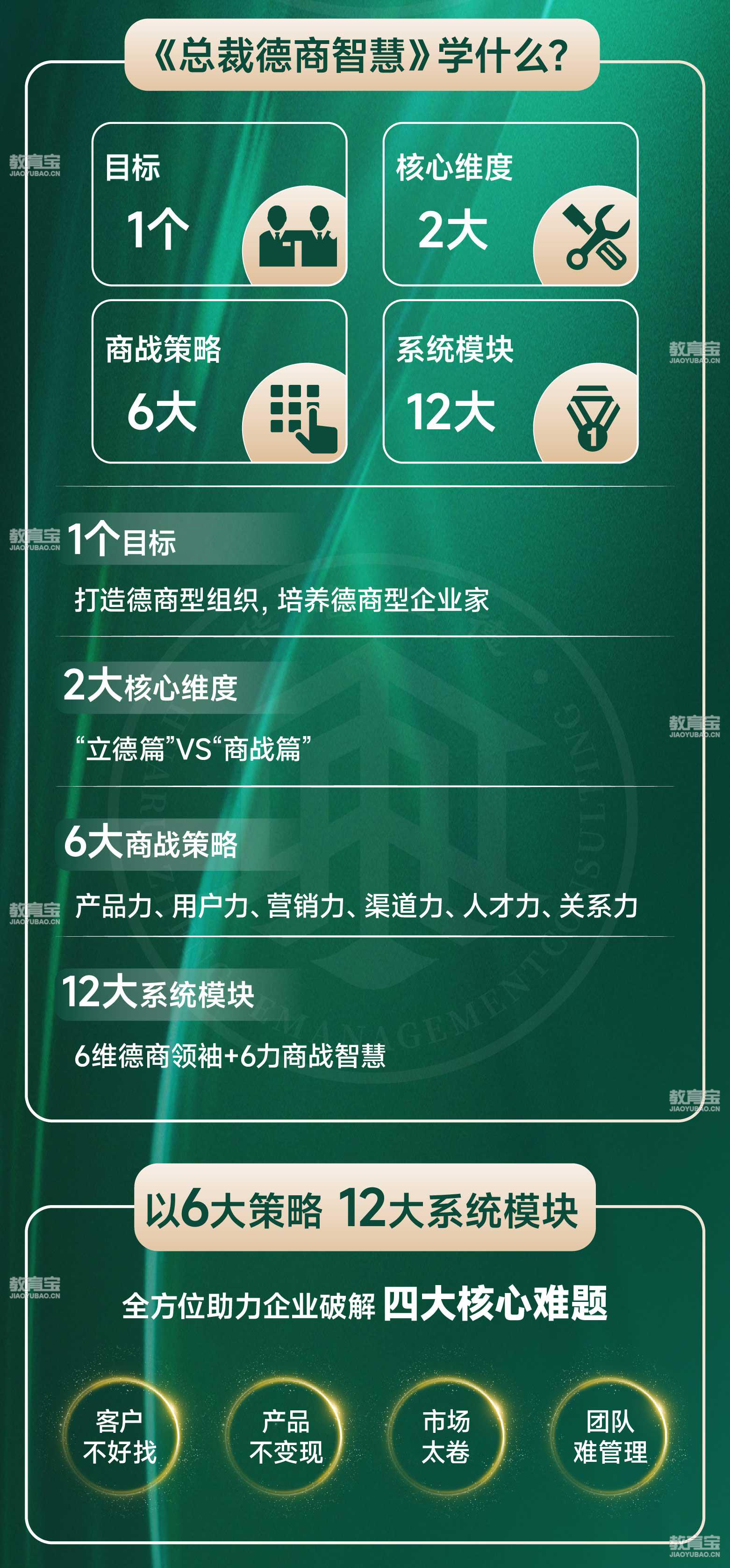课程内容 立德篇:德商认知 德商思维 领袖五德 领袖五危 立德日课 立德之方 商战篇:产品力 用户力 营销力 渠道力 人才力 关系力
